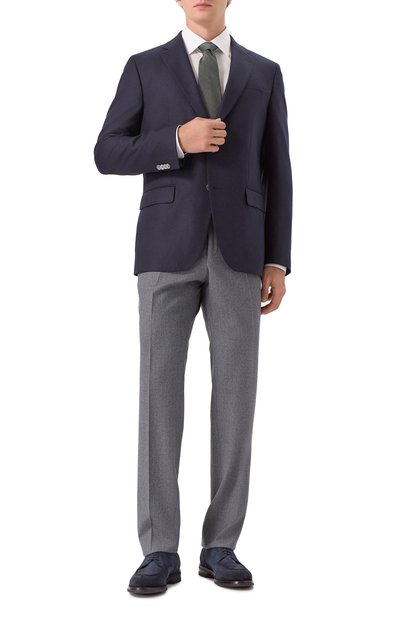 Для пошива темно-синих дерби использовали комбинацию крупнозернистой и гладкой кожи. Миндалевидный мыс декорировали узором «медальон». Ему вторит перфорированный мотив по краям деталей. Сбоку модель дополнили миниатюрной брендированной заклепкой.