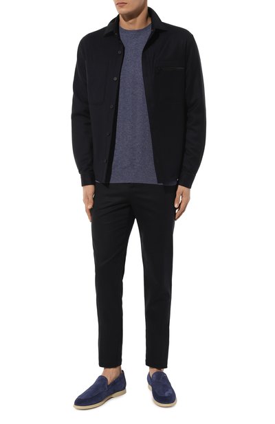 Синие лоферы на гибкой подошве станут удачным завершением непринужденного летнего образа. Модель с миндалевидным мысом сшили из плотного эластичного текстиля, который хорошо отводит тепло и мгновенно адаптируется к форме стопы. Чтобы обувь не потеряла форму, задник и союзку по бокам укрепили деталями из гладкой кожи. Пару украсили серебристой накладкой в виде монограммы из инициалов Стефано Риччи.