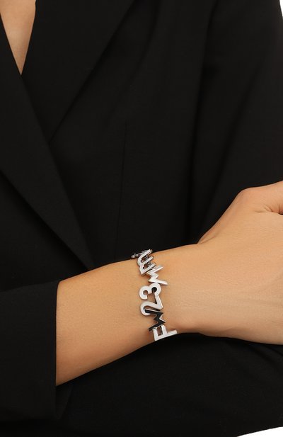 Узкий незамкнутый браслет из ювелирного сплава с гальваническим серебряным покрытием и черной эмалью на первый взгляд кажется предельно лаконичным. Вблизи становятся заметными миниатюрные гравированные цифры, которые складываются в знаковый числовой ряд, отсылающий к нумерации линий бренда.