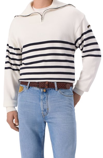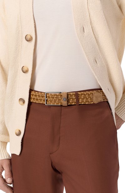 Ремень салатового оттенка сплели в старинной технике intrecciato из узких полос мягкого прочного текстиля, напоминающего гладкую кожу. Небольшую пряжку в виде знакового треугольника окрасили матовой эмалью в тон. Яркий аксессуар поможет создать акцент в комплекте из однотонных вещей.