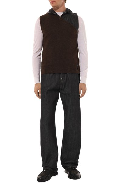 Серый жилет дополнили удлиненным подкладом из гладкого полосатого материала, который деликатно выглядывает снизу. Непринужденный тон модели поддержали спущенными петлями возле левого бокового шва. В образе прямая модель из мягкой шерстяной пряжи подружится с классическими брюками и пенни- лоферами.