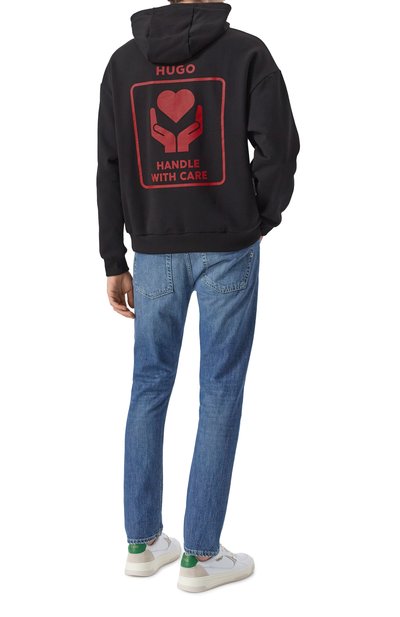 Свободное худи выполнили из плотного хлопкового футера с фактурной изнанкой. Такой мягкий, в меру эластичный материал не выпускает тепло наружу и не пропускает легкий ветер. Дополнительную защиту от прохладного воздуха обеспечивают широкие манжеты и пояс. Единственным декором черной модели стал ярко-красный патч с л оготипом немецкого бренда.
