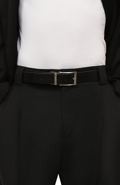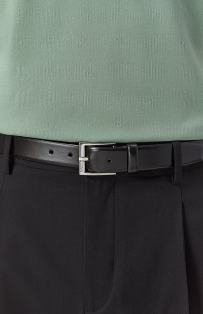 Черный ремень получился универсальным. Его лаконичность лишь немного нарушает фирменная трехцветная заклепка на шлевке. В производстве аксессуара использовали гладкую итальянскую кожу, обработанную по высоким экологическим стандартам. Модель дополни ли прямоугольной металлической пряжкой с выгравированным логотипом.