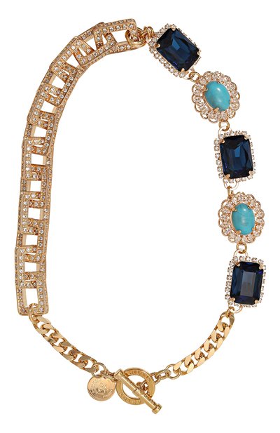 Это колье будто собрали из трех разных изделий. Одну часть выполнили в виде крупных прямоугольных звеньев с прозрачным паве, а другую составили из фигурных деталей с синими и бирюзовыми вставками. Детали соединяет цепочка с T-образной застежкой. Модель изготовили из ювелирного сплава с гальваническим покрытием 22-каратным золотом.