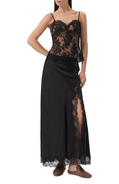 Черную расклешенную миди-юбку сшили из сетчатого кружева с крупным растительным узором, поэтому модель получилась практически прозрачной. Изделие с высокой талией украсили узкой оборкой на эластичном поясе, который обеспечивает удобную посадку.