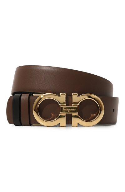 Ремень классической ширины выполнили из матовой кожи, которая за счет бережной выделки получилась одновременно мягкой и прочной. Аксессуар сконструировали так, чтобы его можно было носить как черной, так и коричневой стороной наружу. Изделие застегивается золотистой кобурной пряжкой Gancini.