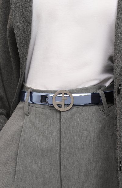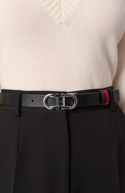 Двухсторонний ремень с двумя шлевками выполнили телячьей кожи. Аксессуар регулируется брендированной кобурной пряжкой Double Gancini.