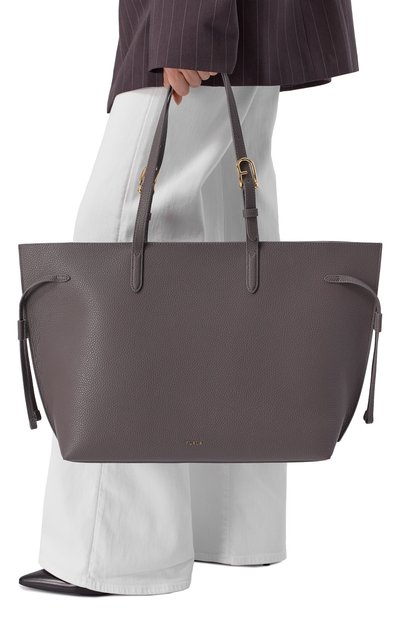 Коричневую сумку Perry сшили из плотной шагреневой кожи. У нее крупнозернистая фактура, поэтому такой материал не боится случайных потертостей или царапин. Основное отделение дополнили разделительным отсеком на молнии и тремя небольшими открытыми карманами. Внутрь поместятся журнал А4, бутылка воды, кошелек, футляр с очками и телефон. В комплекте — брелок.