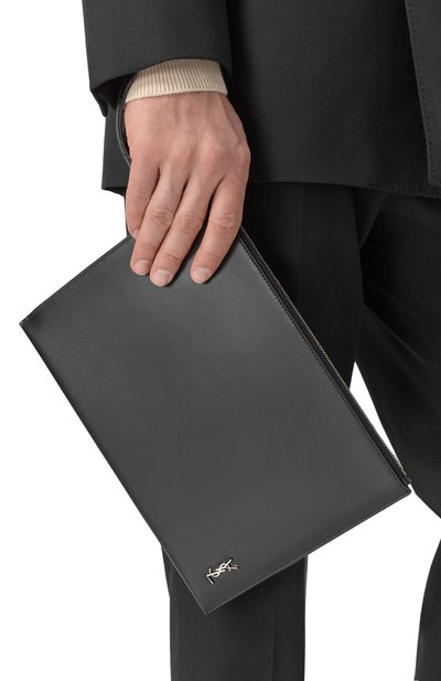 Для изготовления черного футляра использовали прочную матовую кожу. Единственным декором лаконичной модели служит миниатюрный логотип бренда на передней панели. Аксессуар застегивается молнией с пуллером, на котором выгравирована эмблема 4G. Внутрь поместятся планшет и документы формата А5.