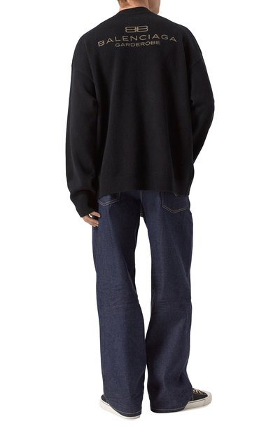 Горловину и низ свитера продублировали широкими вставками, петли на которых частично спустили, придав изделию состаренный вид. Модель выполнили гладью из пряжи на основе шерсти, хлопка и льна. Рукава укрепили накладками, а сзади расположили фирменные белые стежки.