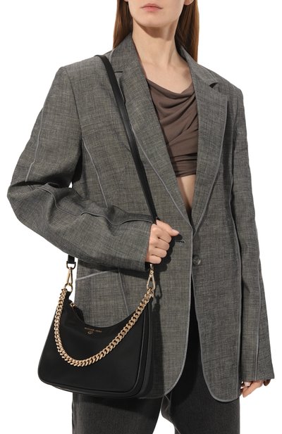 У небольшой черной сумки Jet Set есть все шансы занять место главного акцента в образе. В фокусе внимания модель из мягкой гладкой кожи удерживают сверкающие миниатюрные кристаллы, полностью покрывающие панели. Аксессуар с ажурной серебристой ручкой-цепочкой закрывается молнией сверху. В основное отделение поместятся смартфон, ключи и кошелек.