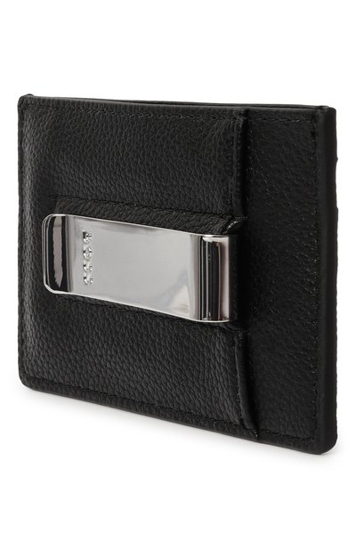Для изготовления черного картхолдера использовали матовую зернистую кожу, на которой долго не появятся заломы и царапины. Функциональные возможности аксессуара с двумя слотами для банковских карт и открытым центральным карманом расширили при помощи зажима для купюр на задней панели. Модель украсили небольшим рельефным логотипом из полированного ювелирного сплава с сияющим серебристым покрытием.