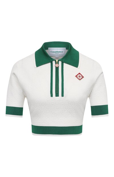 Укороченное белое поло выполнили из нежнейшего вискозного трикотажа, на котором просматривается размноженная эмблема марки. Цветового контраста изделию добавили зелеными деталями — воротником, манжетами, поясом и планкой вдоль молнии спереди. Наши стилисты предлагают оттенить вещь лаконичными черными брюками с низкой посадкой.