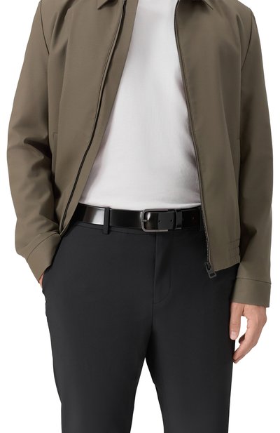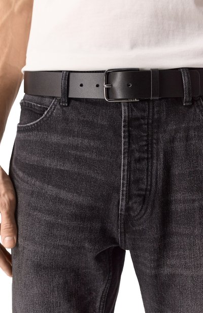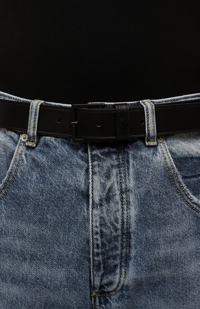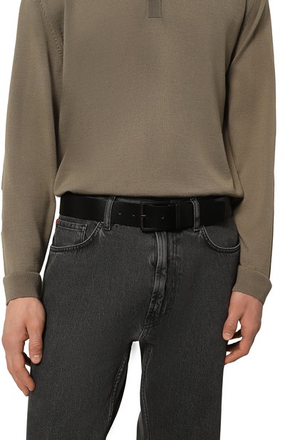 Черный ремень классической ширины выполнили из прочной крупнозернистой кожи, на которой долго не появятся заломы и царапины. Материал приобрели на безотходном пищевом производстве и использовали для его обработки безопасные для природы технологии. Модель с тисненым логотипом на тренчике застегивается лаконичной квадратной пряжкой, закрепленной алыми строчками.