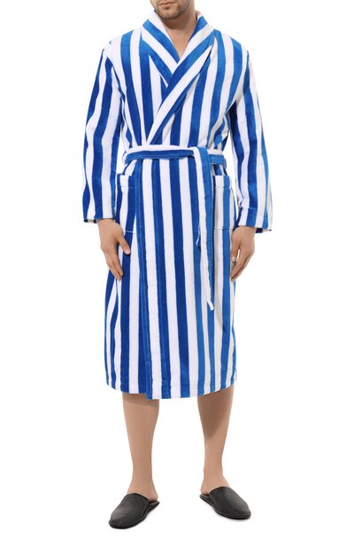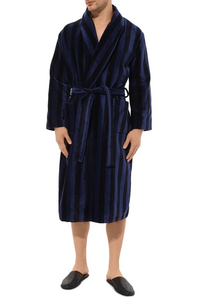 Для изготовления темно-синего халата использовали тонкий нежный трикотаж: материал, связанный из длинноволокнистого хлопка, впитывает лишнюю влагу, хорошо пропускает воздух и почти не ощущается на теле. Модель с объемным капюшоном и поясом-лентой, фиксирующим запах, декорировали фирменным красным логотипом.
