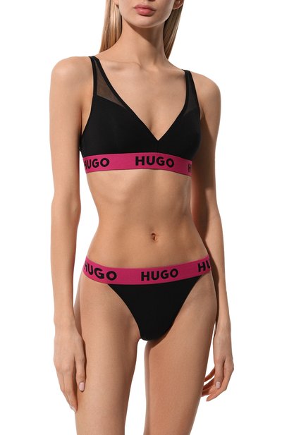 На черных слипах соседствуют два разных материала: мягкий тр икотаж из модала спереди и тонкая полупрозрачная сетка сзади. Стрейчевые волокна делают оба текстиля эластичными, поэтому модель с неоново-розовой брендированной резинкой плотно облегает тело.