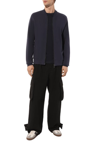 Темно-синюю футболку выполнили из мягкого эластичного джерси с идеально ровной, приятной на ощупь ф актурой, как у шелка. Дышащий материал связали из органического хлопка, выращенного на небольших фермах Африки без применения токсичных химикатов. Спереди — белый миниатюрный логотип.