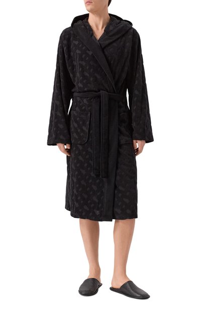 Черный махровый халат с ярким патчем выполнили из органического хлопка, который отлично пропускает воздух и впитывает влагу, а на ощупь он максимально мягкий. В комплекте к вещи с большими накладными карманами предусмотрели широкий пояс.