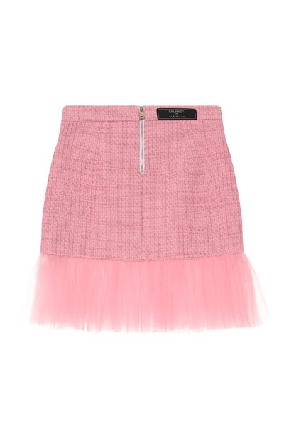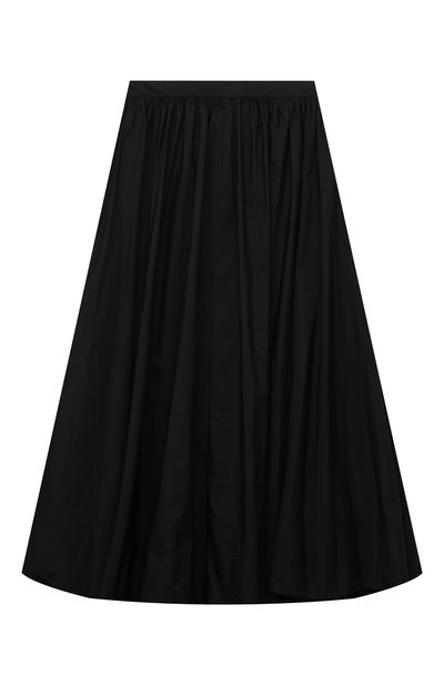 При создании черной расклешенной юбки сделали ставку на блеск: нежную вискозу в основе мягкого материала соединили с серебристым люрексом, который ненавязчиво мерцает в лучах света. Модель с широким поясом, акцентированным брендированной биркой, застегивается потайной молнией сзади.