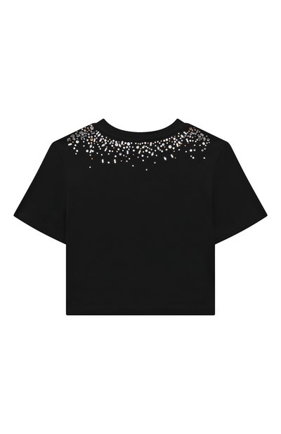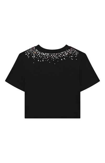 Свободную белую футболку с короткими рукавами делает наряднее декор. Спереди и вдоль горловины модель украсили россыпью сверкающих стразов, создающих эффект широкого ожерелья с подвеской в виде монограммы DG. Для пошива изделия использовали мягкое дышащее джерси из отборного хлопка с длинными тонкими волокнами.