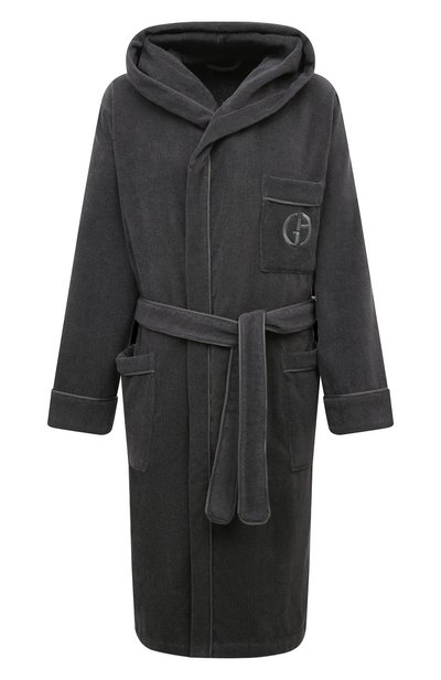 Темно-серый халат длиной чуть ниже колена сшили из мягкого махрового хлопка. Уютный материал хорошо впитывает влагу и сохраняет тепло, обеспечивая комфорт после водных процедур. Модель с капюшоном отделали по краям узким атласным кантом в тон, а на нагрудном кармане вышили шелковистую эмблему бренда. В комплекте – пояс, фиксирующий запах.