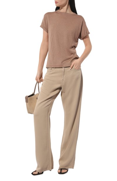 Пуловер деликатного кремового оттенка – универсальный вариант, который подружится с любыми вещами, будь то брюки, юбка или джинсы. Для изготовления модели с короткими рукавами использовали тонкий трикотаж из нежнейшего кашемира, едва ощущающийся на теле и поддерживающий комфортную терморегуляцию. Круглый вырез с пуговицей сзади Джорджо Армани подчеркнул сверкающими миниатюрными кристаллами, имитирующими колье.
