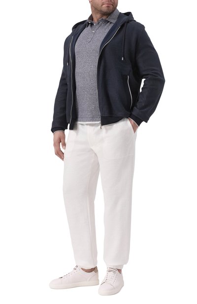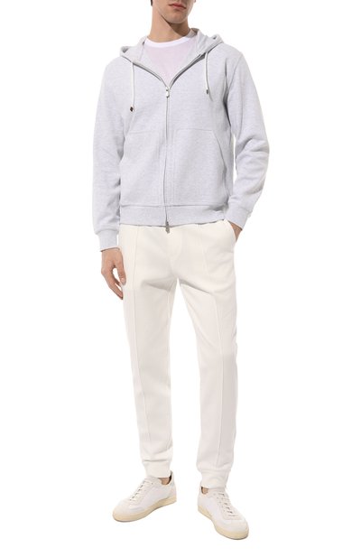 Джоггеры с широким поясом и тремя врезными карманами сшиты из трикотажа на основе полиамида и модала. Эластичные брюки украшены сбоку эмблемой марки, вышитой нитью в тон.