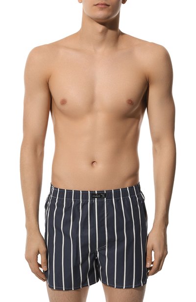 Синие боксеры в узкую белую полоску выполнили из мягкой гладкой ткани, не преп ятствующей циркуляции воздуха. Тонкий материал из тщательно очищенного хлопка приятно ощущается на коже и поддерживает оптимальную терморегуляцию. Эластичный пояс модели украсили небольшой нашивкой с контрастным логотипом.