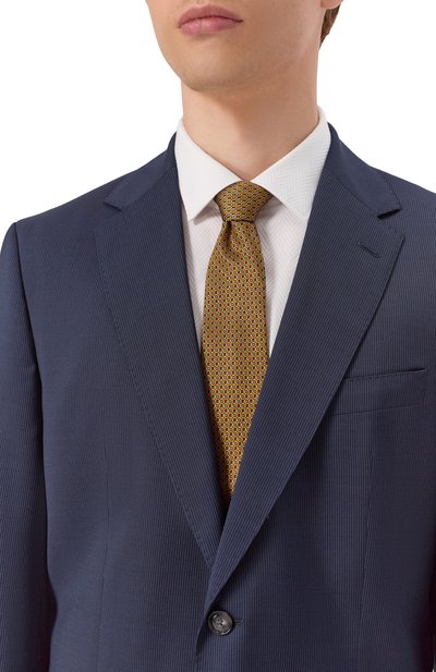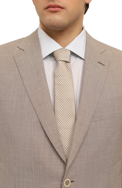 Для создания галстука использовали прочный фактурный жаккард с плотным переплетением нитей в бежевых оттенках. Материал из гладкого шелка и отборного хлопка почти не мнется, при этом легко драпируется. Длины аксессуара хватит, чтобы завязать узел любой сложности.