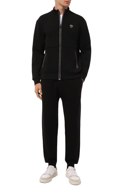 Черный кардиган с длинными рукавами и воротником-стойкой, позаимствовавший свой силуэт у олимпийки, выполнили из мягкого хлопкового трикотажа стрейч. Модель из такого материала комфортно облегает тело, не сковывая движения, отлично пропускает воздух и сохраняет тепло. Принадлежность бренду обозначили вышивкой Frecce Tricolori, посвященной знаменитой авиационной группе высшего пилотажа, и логотипом.