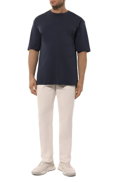 Темно-синий цвет и полное отсутствие декора делают эту футболку максимально лаконичной, а материал — комфортной. Для пошива модели с круглым вырезом использовали гладкое джерси из органического хлопка Giza. У него особенно длинные волокна, за счет которых изделие получилось исключительно приятным на ощупь.