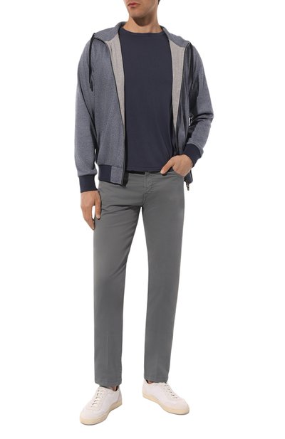Темно-серую футболку с V-образной горловиной выполнили из особенно мягкого джерси, изготовленного из мерсеризованного хлопка. У такого материала — гладкие нити, очищенные от ворса, поэтому полотно прочнее обычного, а на ощупь напоминает шелк. Лаконичная модель подружится с вещами разных оттенков.