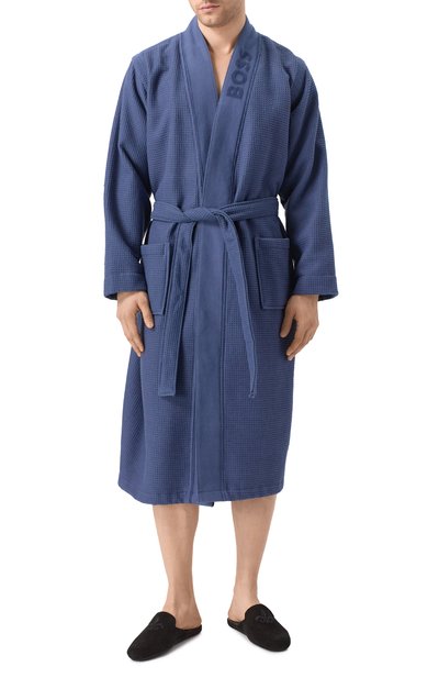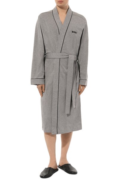Черный халат с длинным поясом-лентой сшили из мягкого хлопкового джерси, которое отлично пропускает воздух и отводит влагу. В меру плотный материал оставляет движения свободными и максимально приятен на ощупь. Серебристый логотип немецкой марки, вышитый на груди, поддержали узким кантом вдоль широких лацканов и манжет.