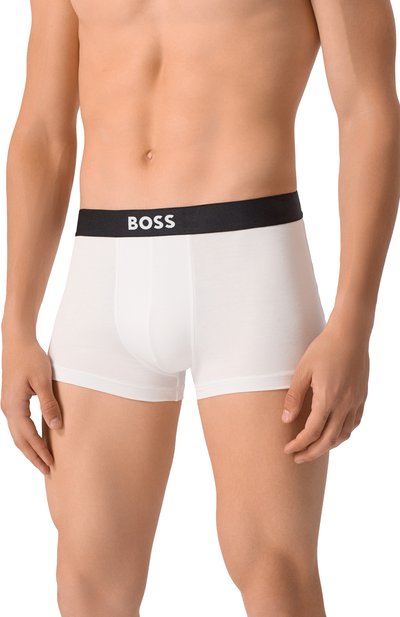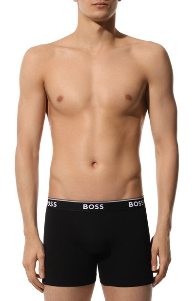 Черные боксеры сшили из мягкого эластичного трикотажа на основе отборного хлопка с длинными прочными волокнами. Материал не мешает телу дышать, быстро отводит влагу и оптимально тянется. Широкий пояс-резинку декорировали контрастным паттерном из логотипа. В комплекте – еще двое аналогичных трусов белого и серо го цвета.