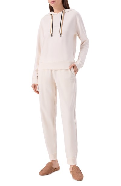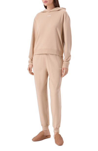 Брюки нежного кремового оттенка с эластичным поясом-кулиской и двумя карманами сшили из тонкого трикотажа стрейч на основе мягкого модала. Для изготовления шелковистого дышащего материала использовали целлюлозу из древесины возобновляемых лесов, поэтому модель получилась не только комфортной, но и экологичной. Наши стилис ты предлагают сочетать изделие с майкой и тапочками в домашнем образе.