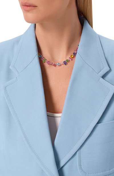 Основа этого колье из ювелирного сплава с родиевым покрытием остается почти невидимой под сверкающими кристаллами разных огранок и оттенков, формирующих асимметричный узор. Разноцветные декоративные элементы дополняют и небольшую цепочку, регулирующую длину аксессуара с замком-карабином.