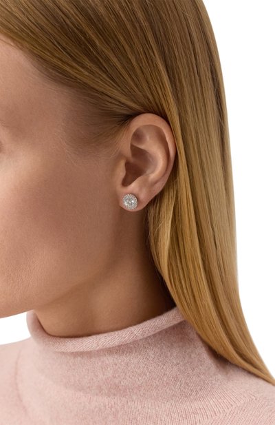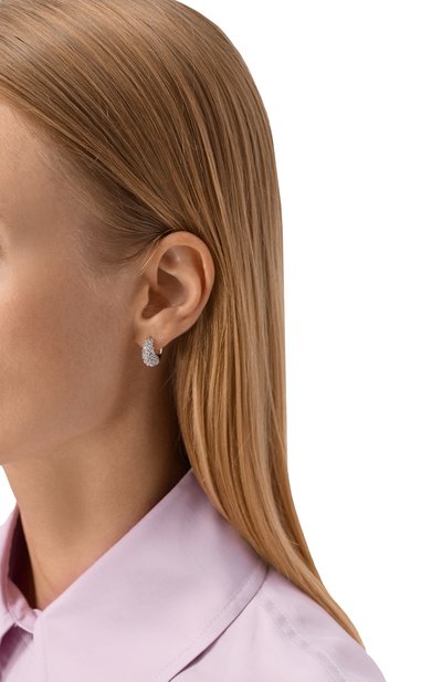 Небольшие серьги-кольца выполнили из легкого прочного сплава с родиевым покрытием, не тускнеющим со временем. Холодный блеск металла усиливает яркое сияние миниатюрных прозрачных кристаллов, которыми полностью инкрустировали аксессуар с подвижными подвесками в форме полумесяца.