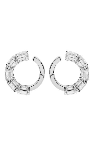 Небольшие клипсы, стилизованные под серьги-кольца, можно зафиксировать на любом месте уха. Для изготовления модели использовали металл с напылением из с еребристого родия. Его Холодный блеск усиливает сияние прозрачных квадратных кристаллов, покрывающих внешнюю сторону аксессуара.
