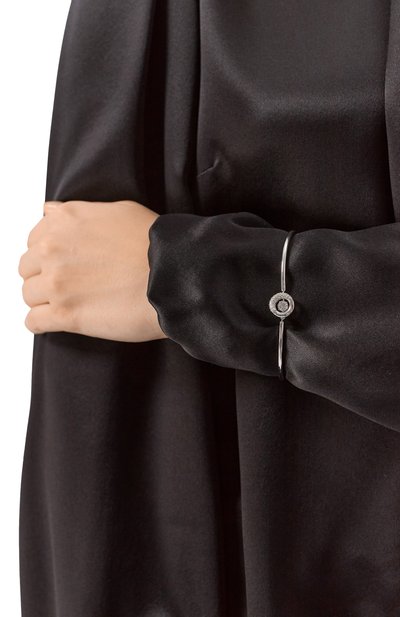 Тонкий браслет-обруч изготовлен вручную из гипоаллергенного ювелирного сплава. Зеркальный блеск родиевого покрытия перекликается с сиянием миниатюрных прозрачных кристаллов, которыми инкрустированы шарм-полумесяц и сам аксессуар. Посадка на запястье регулируется при помощи цепочки с дополнительными звеньями.