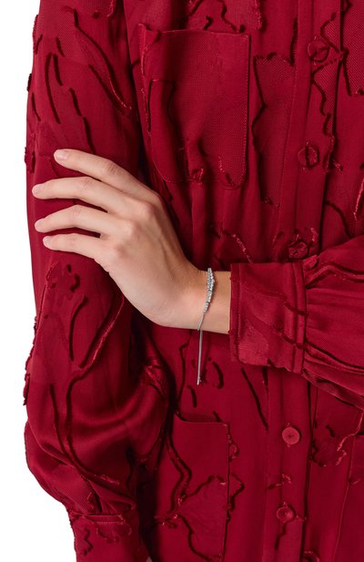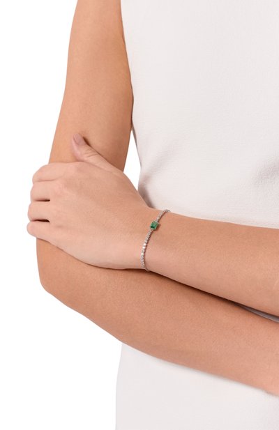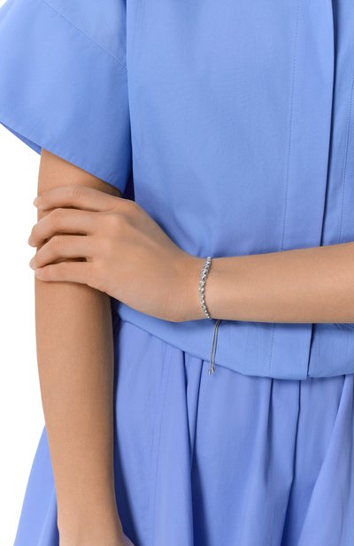 В коллекцию Constella, вдохновленную звездным небом, вошел браслет из ювелирного сплава, покрытого родием. Узкую цепочку якорного плетения украсили крупным синим кристаллом овальной огранки, обрамленным прозрачным паве. Посадку украшения на запястье удобно регулировать скользящей застежкой.