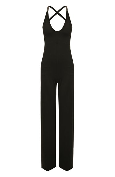 Черный комбинезон с открытой спиной – эффектная альтернатива длинному платью. Для пошива приталенной модели со слегка расклешенными брючинами использовали эластичный шелковистый материал, который почти не мнется и оптимально тянется, обеспечивая комфортную посадку. Немного блеска изделию с глубоким V-образным вырезом добавляют перекрещивающиеся на спине широкие бретели, покрытые сверкающими стразами.