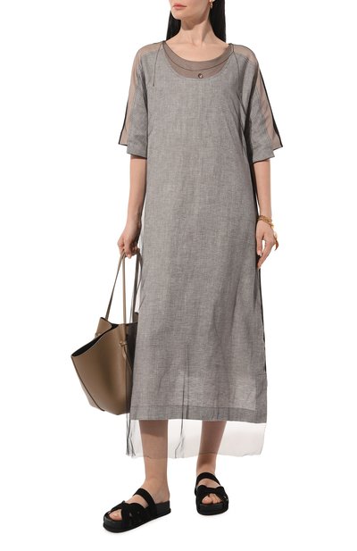 Для поши ва серого меланжевого платья Джузеппе ди Морабито выбрал тонкий хлопковый трикотаж. Лаконичным, напоминающим футболку лифом с капюшоном дизайнер уравновесил асимметричный подол с драпировкой. Наши стилисты предлагают носить модель с сапогами на шпильке и небольшой сумкой.