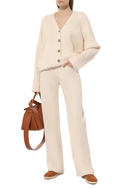 Для создания кардигана кроя Loose fit выбрали ворсованный трикотаж из мериносовой шерсти. Модель с глубоким V-образным вырезом застегивается контрастными пуговицами.