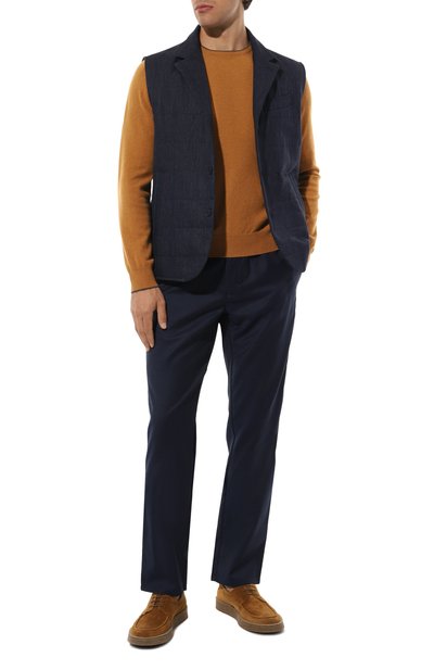 Синие брюки с глубокими защипами спереди получились менее формальными благодаря широкому эластичному поясу-кулиске. За комфорт в течение дня отвечает тонкий легкий габардин из шелковистой шерсти: модель из такого материала приятно ощущается на коже, почти не мнется и не пилингуется со временем.