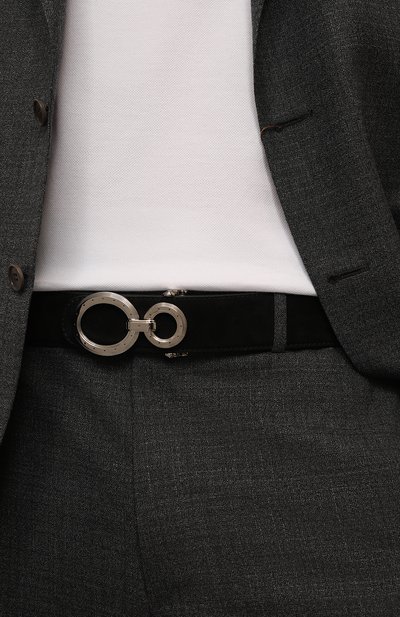 Для изготовления черного регулируемого ремня средней ширины использовали матовую кожу с тисненым шевронным узором. Аксессуар, укрепленный дополнительным слоем материала для прочности, застегивается на круглую пряжку в виде монограммы основателя бренда, Джорджо Армани. Универсальная модель гармонично дополнит и джинсы, и брюки.