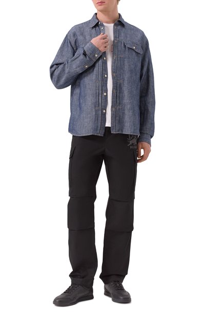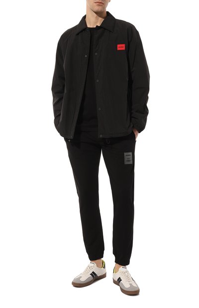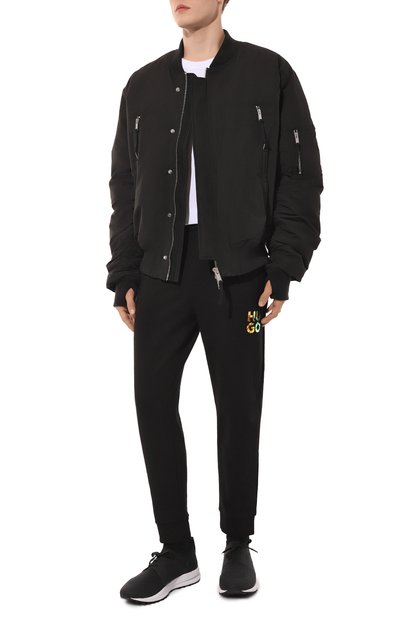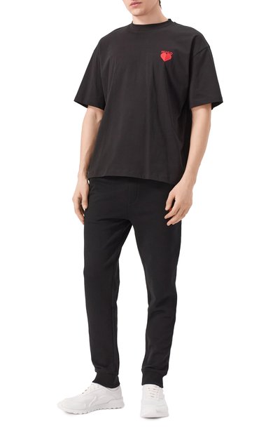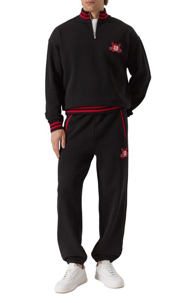 Эти черные джоггеры с эластичным поясом-кулиской и двумя карманами станут комфортной основой повседневного образа. Для пошива модели использовали приятный телу хлопковый трикотаж френч терри, который отлично пропускает воздух и слегка тянется, не сковывая движения. Принадлежность бренду обозначили крупным красным принтом-логотипом на брючине.