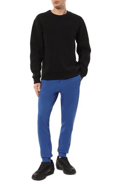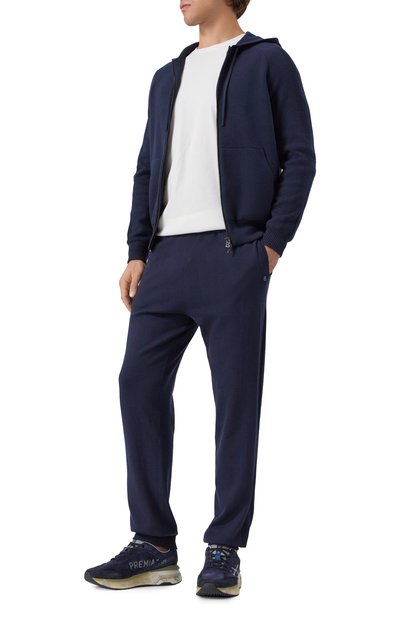 Синие джоггеры с регулируемым поясом-кулиской удобно садятся по фигуре, не стесняя движения. За комфорт отвечает как выверенный крой, так и мягкий хлопковый трикотаж, из которого выполнили изделие. Материал, укрепленный полиэстером, слегка тянется. Слева модель украсили золотистой вышивкой в виде короны и пч елы.
