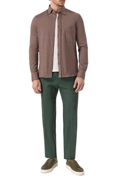 Рубашка из хлопкового трикотажа впишется как непринужденный образ с джинсами и футболкой, так и в более элегантный с пиджаком и брюками. Модель с вытачками на спинке застегивается пуговицами в тон.