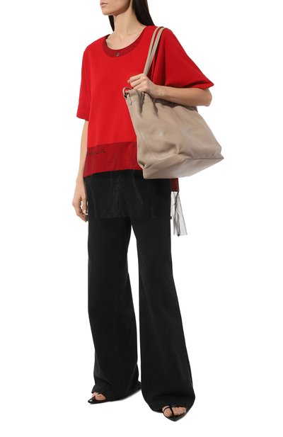 Яркая футболка из хлопкового джерси станет главным акцентом в образе с вещами сдержанной палитры. Единственным декором модели стал кант из знаковой цепочки мониль на круглой горловине сзади.