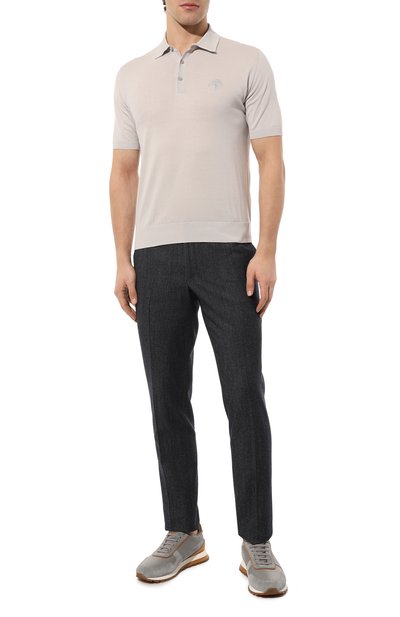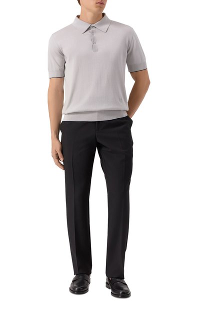 При создании светло-серого поло привычному пике предпочли трикотаж с рифленой фактурой, который идеально тянется в ширину. Исключительно приятный на ощупь материал связали из нежного премиального хлопка, хорошо пропускающего воздух, а в гладкости и прочности не уступающего шелку. Изделие с узкой белой полоской по кр аю манжетов застегивается тремя пуговицами.